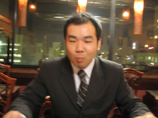 テーブルに着くや否や、ビールを む、ハシー 君。